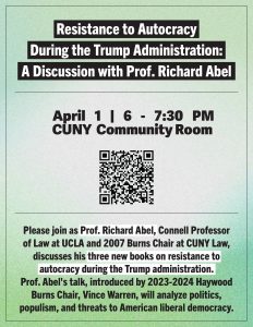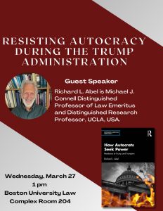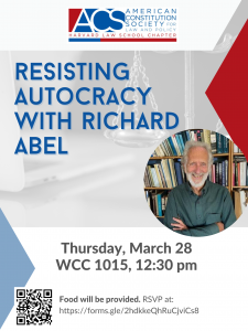 Events Richard L. Abel PT March TBDUCLA Law School ACS February 29, 2024 Lopate at Large, New York City, New York 1 PM ET Monday, March 11, 2024WWGH, Columbus, OH11:15 AM – 12 PM PT Tuesday, March 12, 2024Mid-West Family Springfield, Champaign, Decatur & Springfield, IL10:57 AM PT / 1 PM CT Wednesday, March 13, 2024 Tilting at Windmills https://tiltatwindmills.com/episode/mike-is-wrong-about-autocrats-w-richard-abel 11 AM PT / 2 PM ET Wednesday, March 27, 2024Boston Univ. Law School, American Constitution Society 1-2 PM ET Northeastern Univ. Law School 4:30 – 5:30 PM ET Thursday, March 28, 2024Harvard Law School, ACS 12:30-1:30 PM ET Friday, March 29, 2024Harvard Law School 9 AM – 2 PM ET Monday, April 1, 2024 TBDCUNY Law School Monday, April 8, 2024KSVY, Sonoma, CA11:10 – 11:20 AM ETKKOB / TJ Trout Show, Sonoma, CA11:10 – 11:20 AM ET Wednesday, April 24, 2024UCLA Law School faculty talk: lunch Wednesday, April 24, 2024UCLA Law School faculty talk: lunch Monday, April 29, 2024Stanford Law School, Center for Study of the Legal Profession: lunch https://law.stanford.edu/event/defending-american-democracy-resistance-to-autocracy-from-trump-and-trumpism/ 12:45 – 2:00 PM PT Tuesday, May 7, 2024Progressive Matters5:00 – 5:45 PM PT Friday, May 10, 2024Praxis Peace Institute4:00 – 5:00 PM PT Tuesday, May 21, 2024UCLA Extension 11:00 AM – 1:00 PM PT Friday, May 31, 2024Salem News Channel8:30 AM – 8:40 AM PT